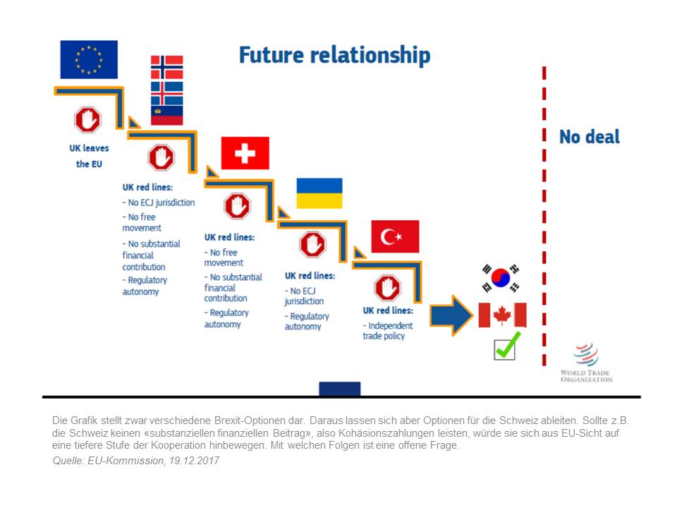 Die Grafik stellt zwar verschiedene Brexit-Optionen dar. Daraus lassen sich aber Optionen für die Schweiz ableiten. Sollte z.B. die Schweiz keinen «substanziellen finanziellen Beitrag», also Kohäsionszahlungen leisten, würde sie sich aus EU-Sicht auf eine tiefere Stufe der Kooperation hinbewegen. Mit welchen Folgen ist eine offene Frage. Quelle: EU-Kommission, 19.12.2017
